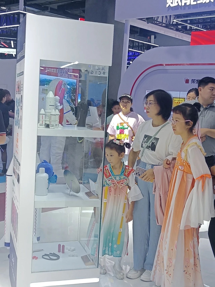 在展位现场,有的观众对于展示的储氢瓶内胆专用材料高度关注,并有强烈的合作意愿,有的观众对展示的软包装胶黏剂主动提出市场开发合作意向,还有很多观众带着孩子逐一学习观摩展出的化工领域创新产品。可以说,化工集团的主题展位既是商业合作的沟通交流平台,又是了解化工、学习知识的科普教育平台。